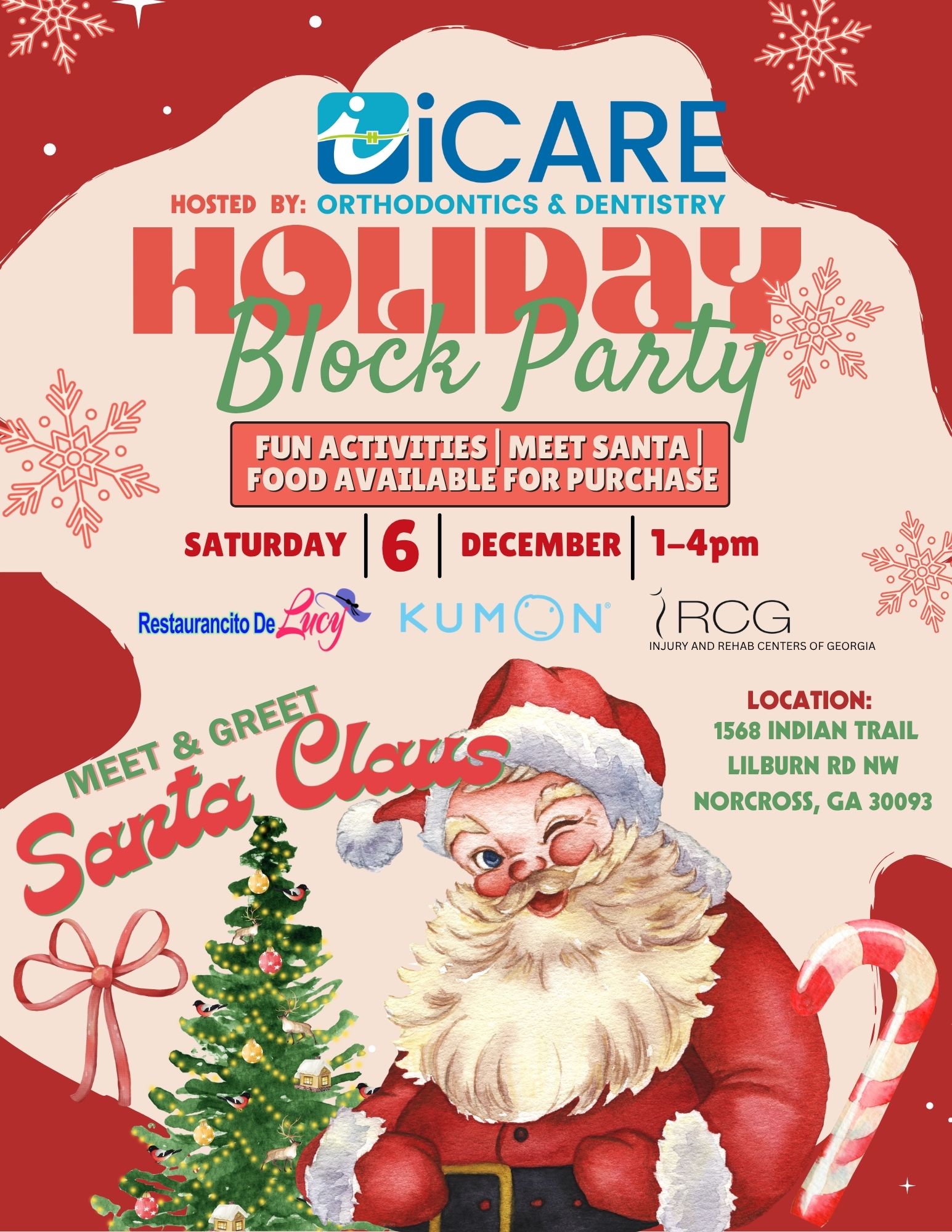 Holiday Block Party – Meet & Greet with Santa | iCare Orthodontics & Dentistry Holiday Block Party – Meet & Greet with Santa! Friday, December 6 | 1:00 PM – 4:00 PM Hosted by iCare Orthodontics & Dentistry Join us for a fun and festive afternoon filled with holiday cheer! Bring your family and friends for exciting activities, cheerful music,... read more »